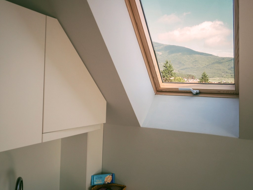 Намерих апартамент в много хубав малък, нов хотел на име The House. Не е обичайният нискобюджетен вариант, който търсим обикновено, дори искаха доста допълнително заплащане за кучето, но решихме да се поглезим 🙂 Апартамент номер 7 е на последния етаж в The House, в квартал Каменица, с тераса с най-хубавата гледка, от нея се виждаха и Милеви скали, много приятна светлина от капандурите във всички стаи, включително и банята. Има голям хол с кухненски бокс, тераса с маса за кафе, и спалня и баня. Много хубав семпъл дизайн. Само картината на стената не ми хареса 🙂